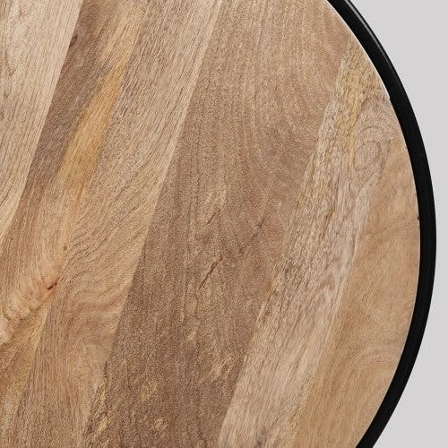 Each of the three circular shelves is crafted from beautiful, light-toned Solid Wood (likely Mango or Acacia), showcasing a distinct grain pattern. The shelves are securely framed by a curving, black metal structure that gives the table its distinctive "stacked" or "nesting" appearance.