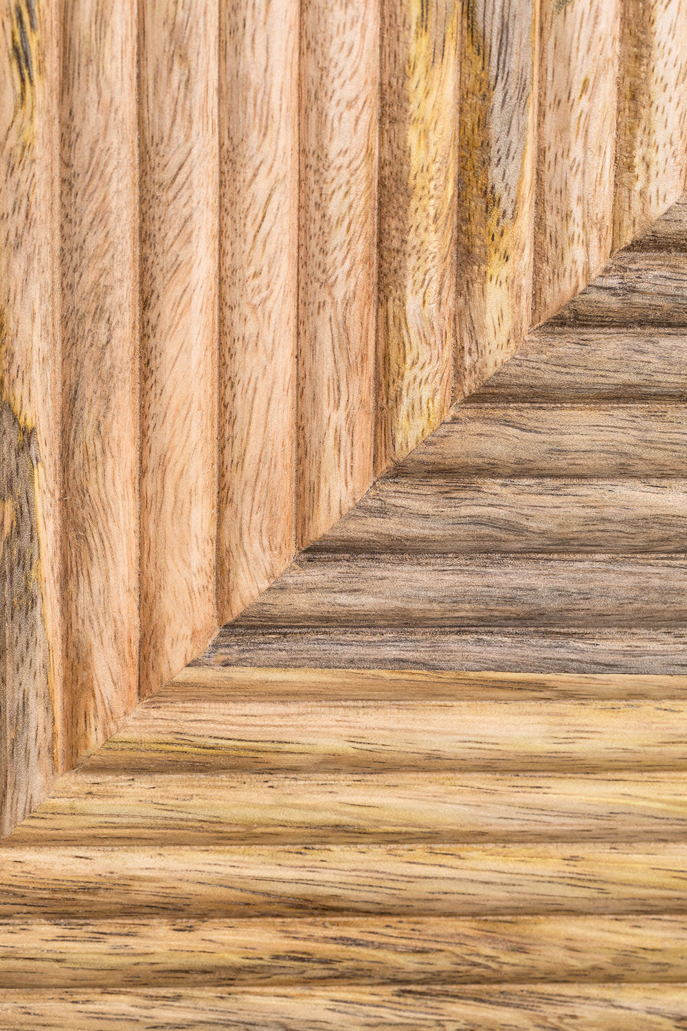 Make a distinctive statement with this trending Geometric Ribbed Wood Sideboard. This piece expertly merges the warmth of natural wood with a captivating, modern texture. The four-door facade features detailed fluted or ribbed carving, meticulously arranged to form a large central diamond or chevron pattern, creating an incredible focal point.