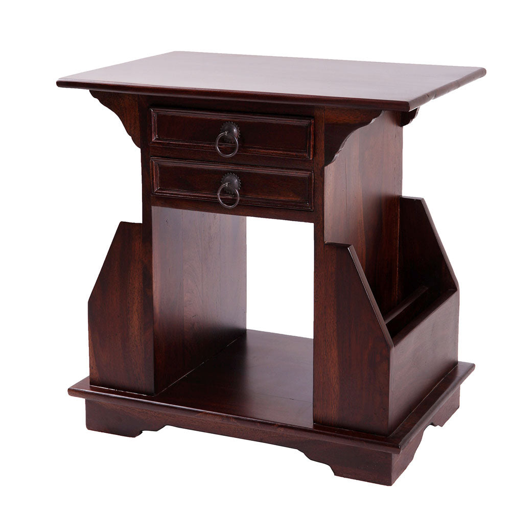 Add a touch of timeless charm to your living space with this beautifully crafted Bedside cum Magazine Table. Expertly designed for both style and utility, this versatile piece features two compact drawers with antique ring handles, ideal for storing your nighttime essentials or daily knick-knacks. The lower open shelves on either side offer ample space for neatly organizing books, magazines, or decor pieces.