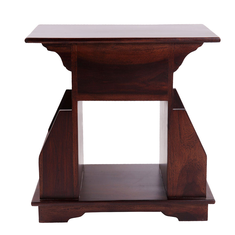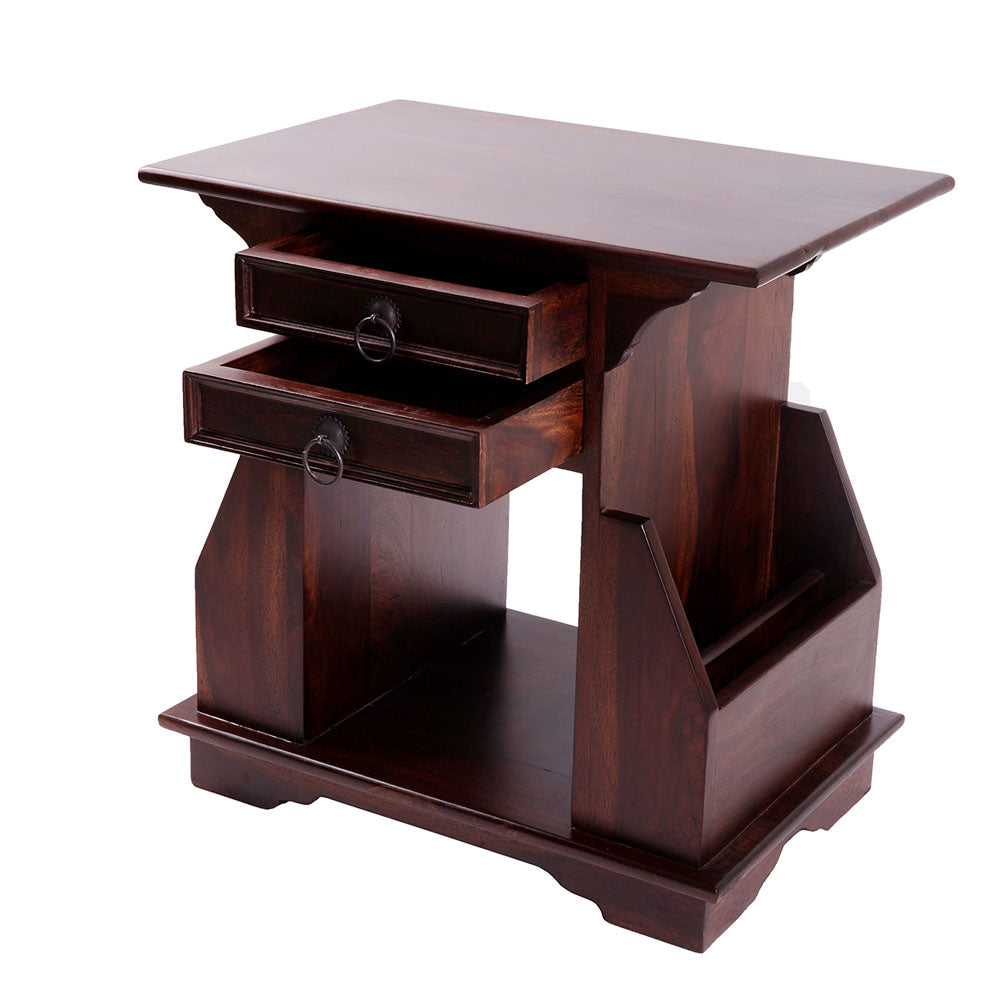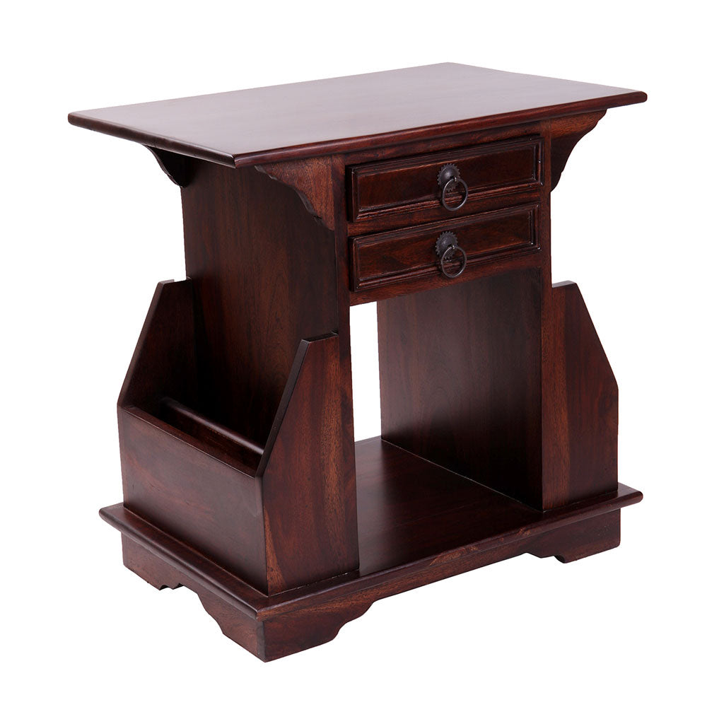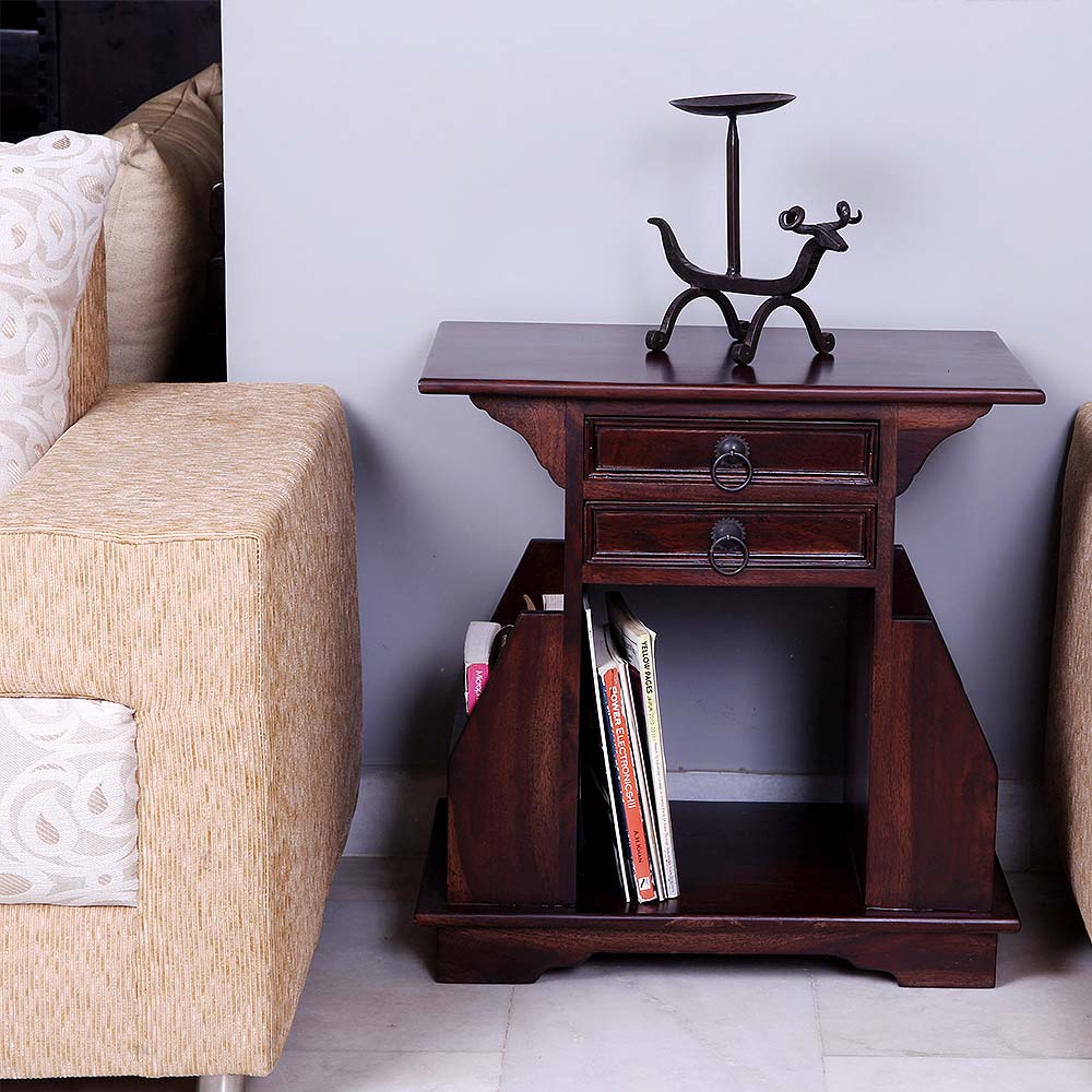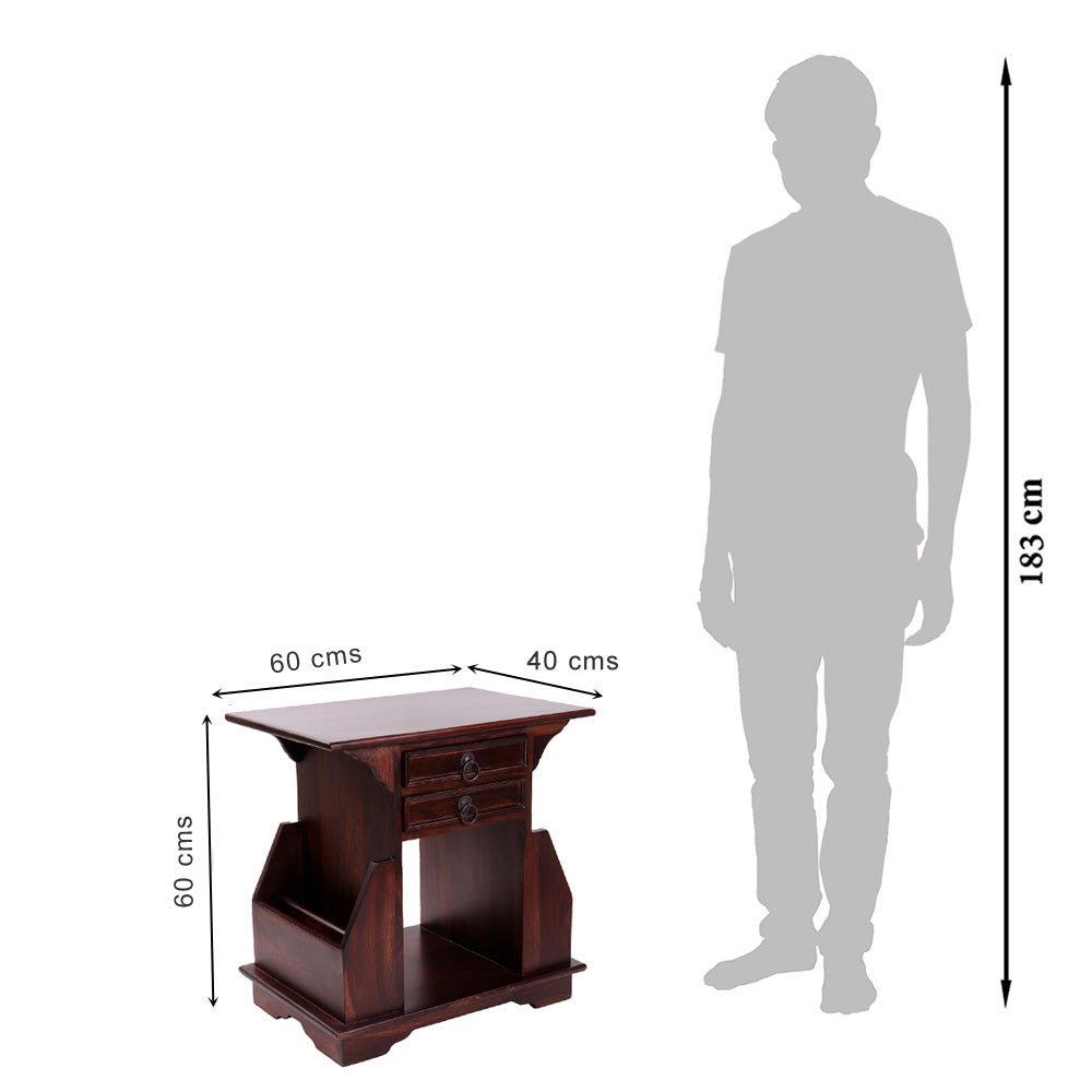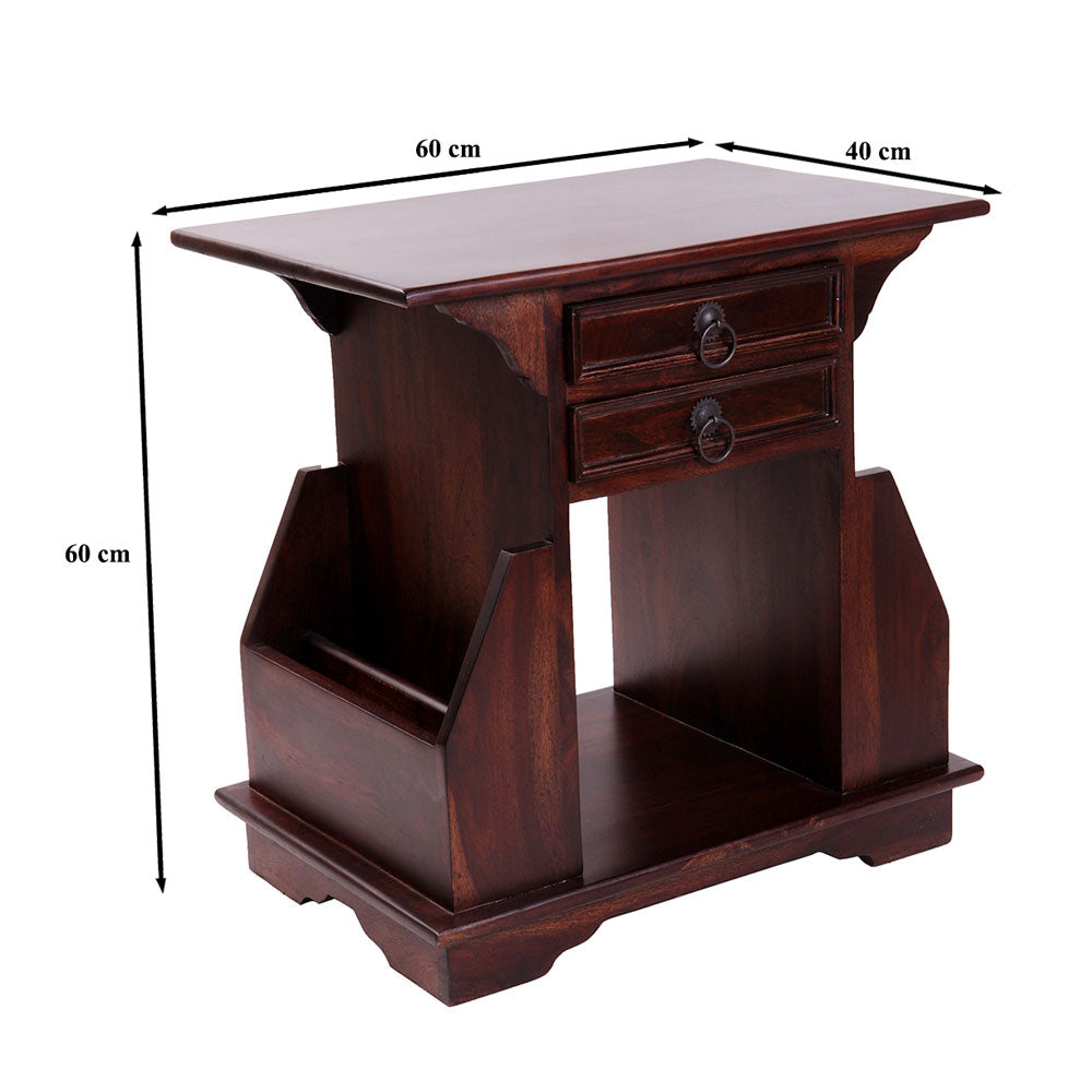 Add a touch of timeless charm to your living space with this beautifully crafted Bedside cum Magazine Table in rich walnut finish. Expertly designed for both style and utility, this versatile piece features two compact drawers with antique ring handles, ideal for storing your nighttime essentials or daily knick-knacks. The lower open shelves on either side offer ample space for neatly organizing books, magazines, or decor pieces.