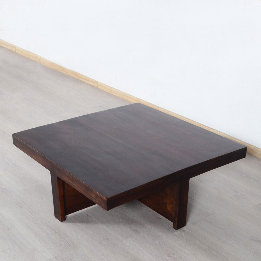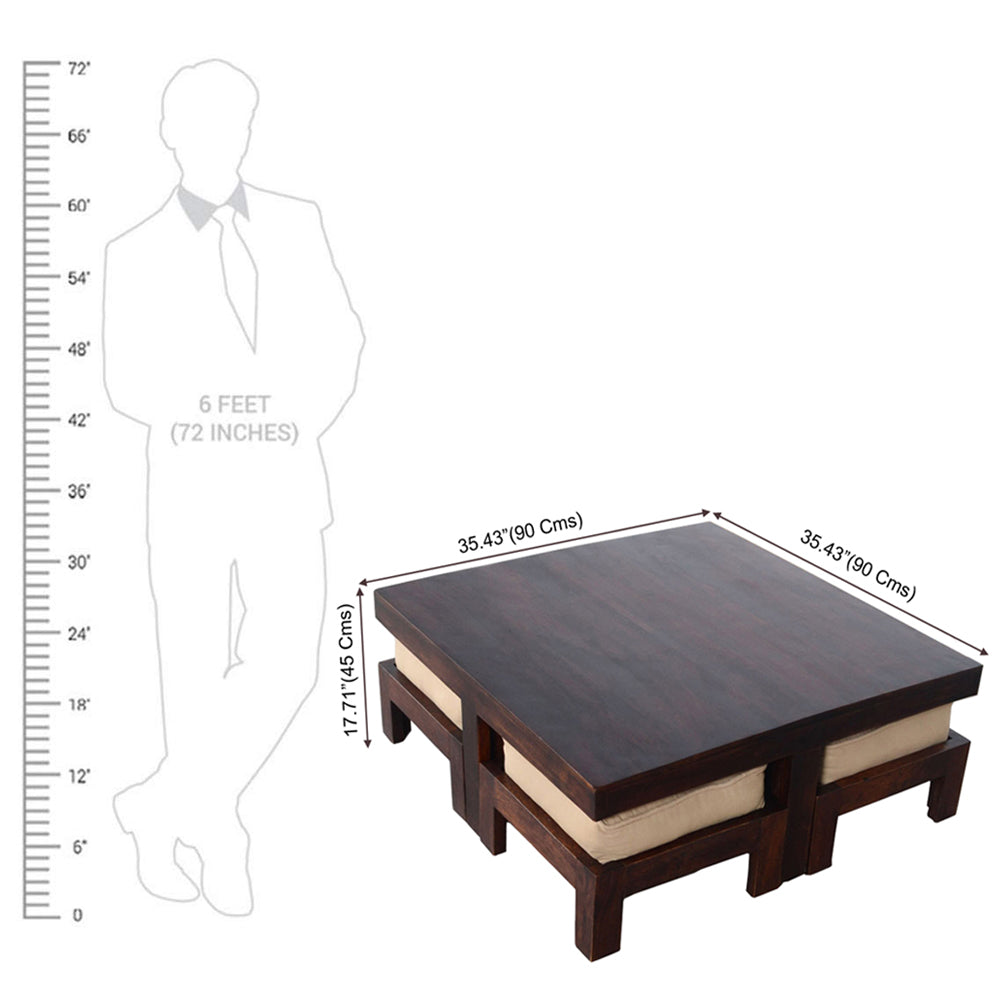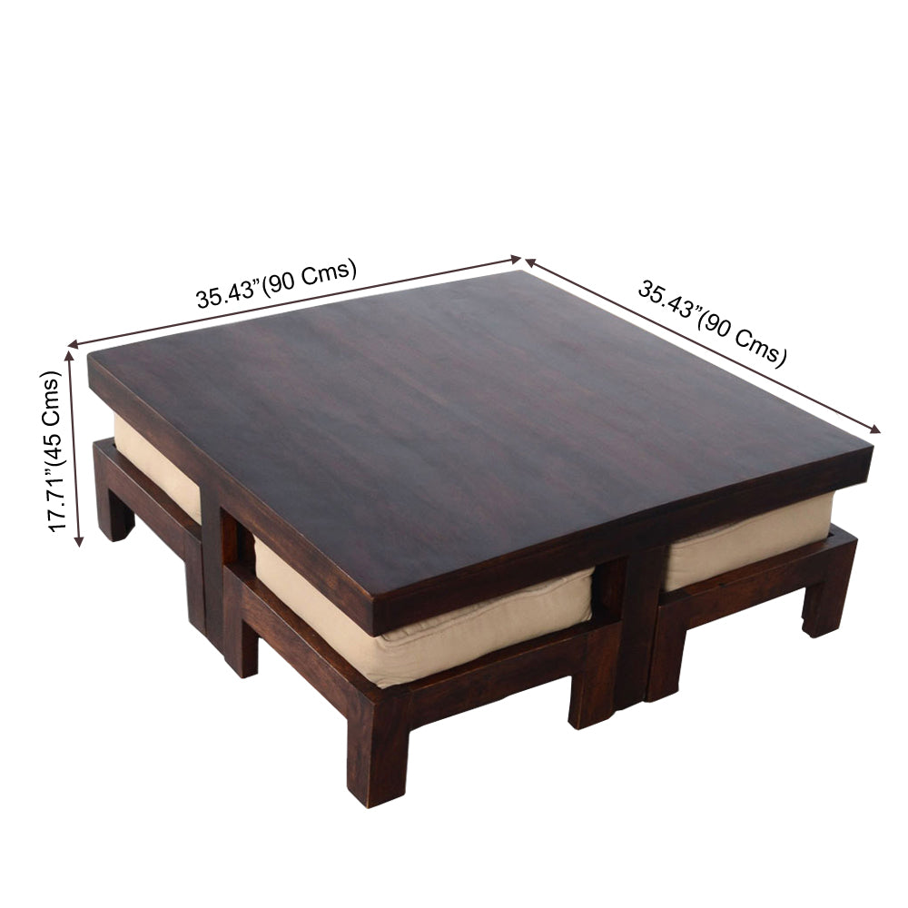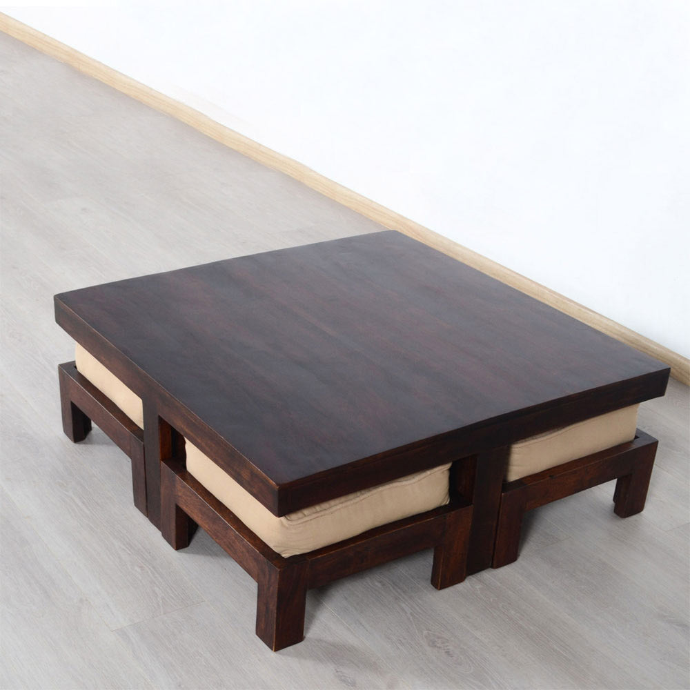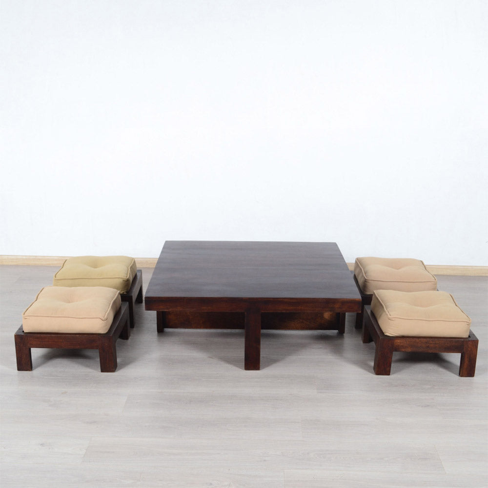 Upgrade your living space with the elegant Kivaha 4-Seater Coffee Table Set, crafted from premium solid wood and finished in a rich walnut tone. This low-height, square coffee table is perfect for modern and traditional interiors alike. The set includes four comfortable floor cushions neatly tucked under the table, making it ideal for casual seating, tea time, or relaxed gatherings.