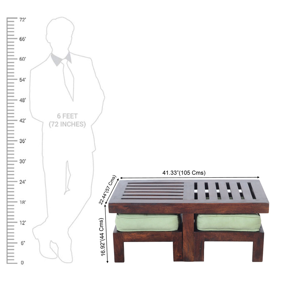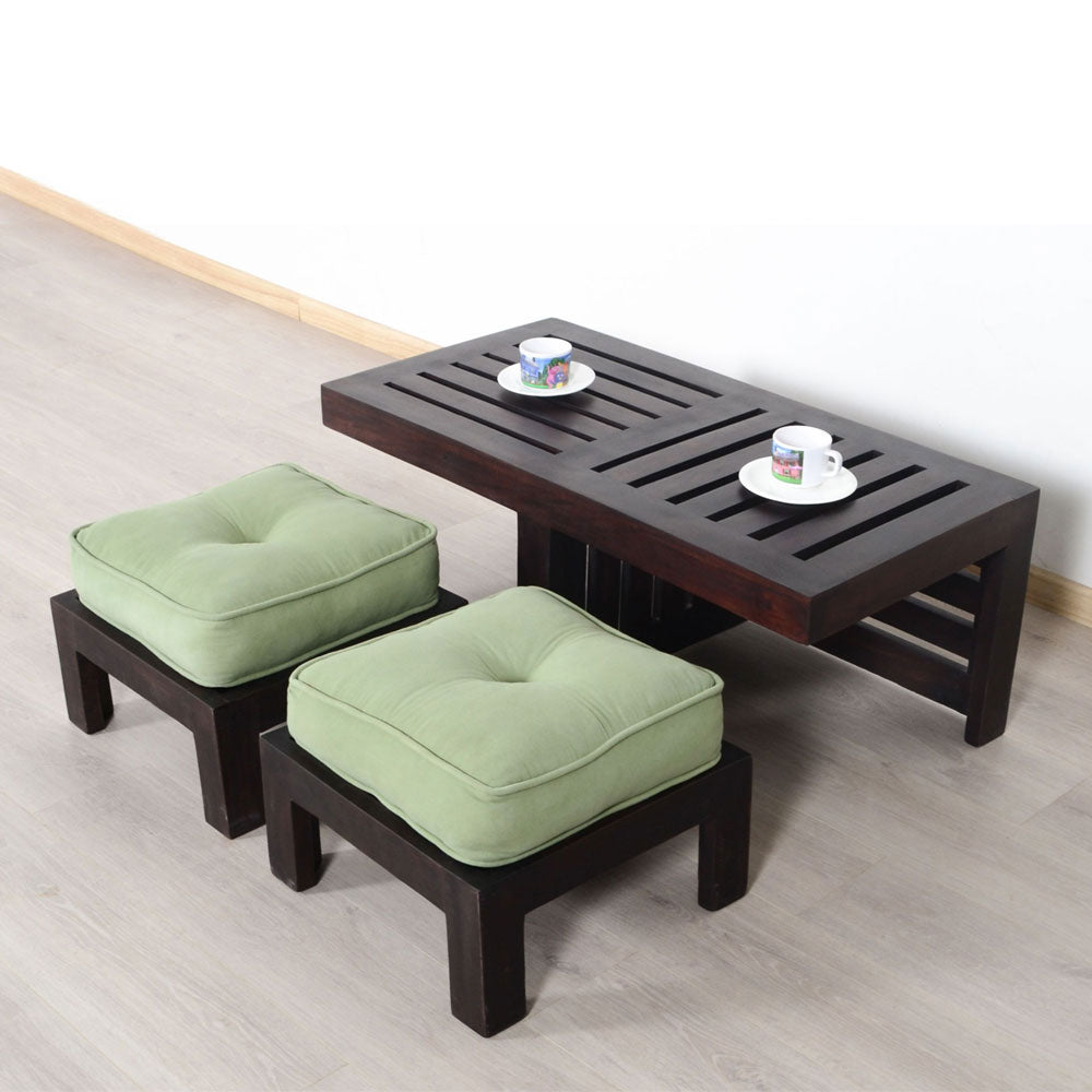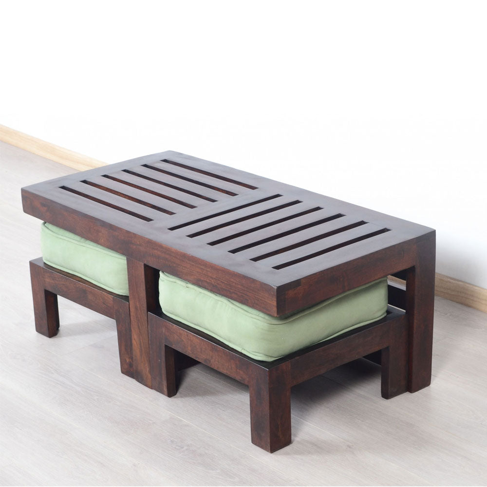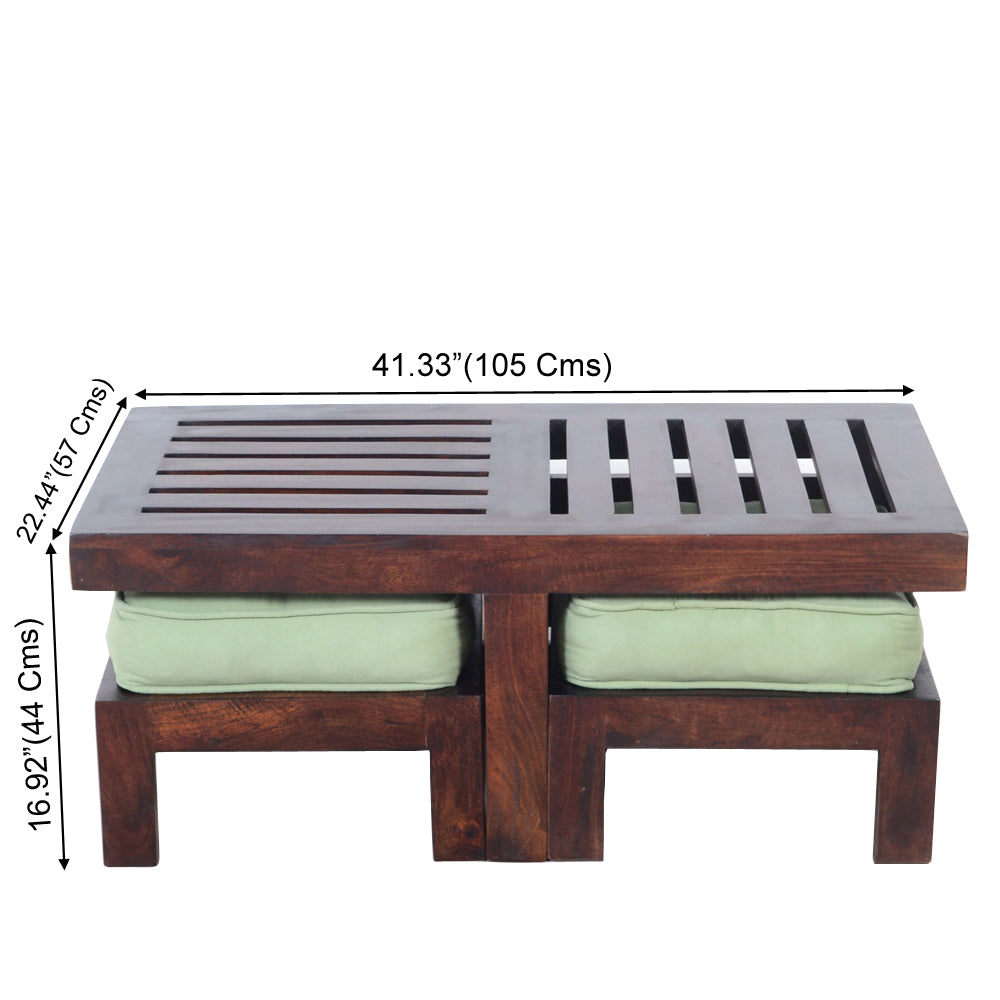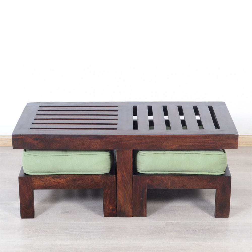 Upgrade your living space with the stylish and space-saving Kivaha Strip 2-Seater Coffee Table Set. Crafted from premium solid wood, this set includes one slatted-top coffee table and two compact stools with plush, green cushioned seats for added comfort.