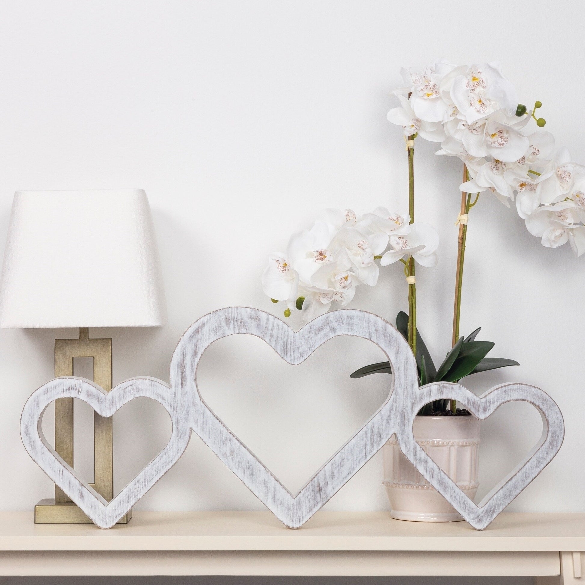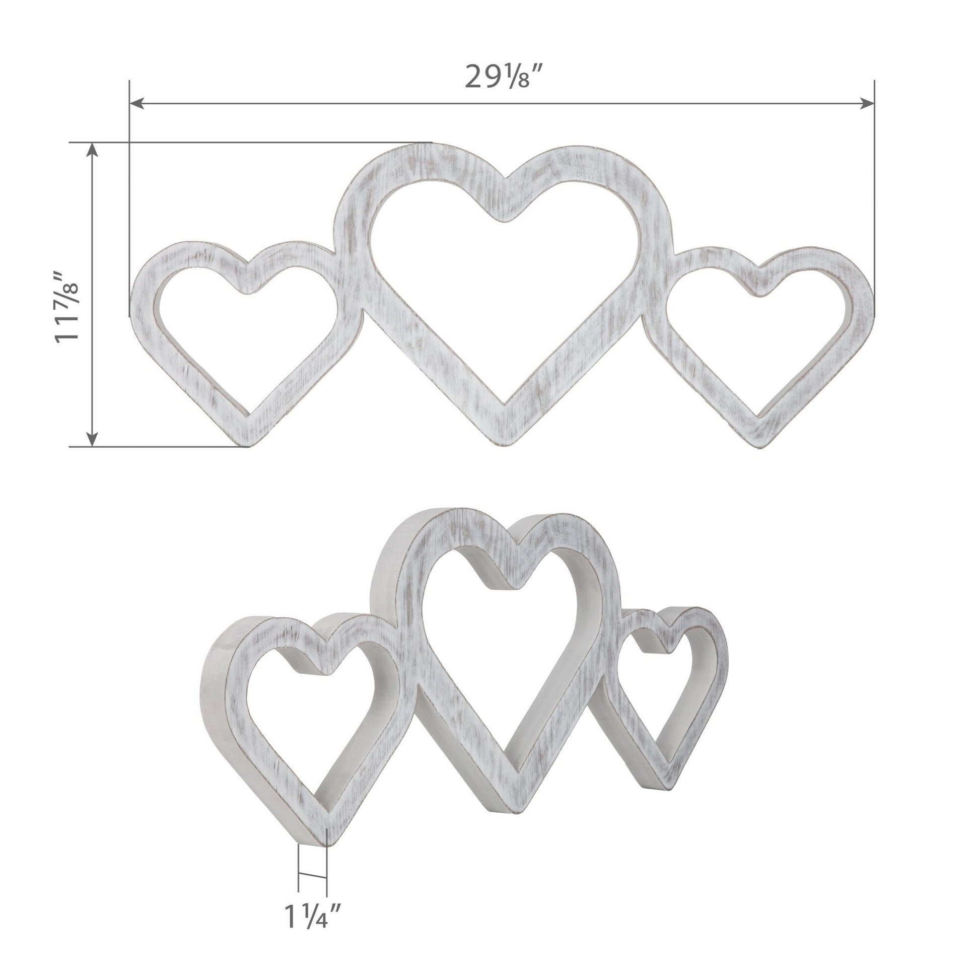 Bring timeless charm and heartfelt sentiment into your home with this Large Whitewashed Triple Heart Wood Decor. Crafted from high-quality wood and finished with a beautifully distressed whitewash, this piece features three interlinked heart-shaped outlines in varying sizes, symbolizing unity, love, and family. Whether you're decorating a cozy farmhouse space or adding a romantic touch to a modern setting, this decor piece is the perfect blend of rustic and elegant. Its freestanding design makes it ideal for displaying on a shelf, mantel, console table, or even a windowsill. You can also mount it on the wall with appropriate hardware for a charming vertical accent in your living room, hallway, bedroom, or entryway.