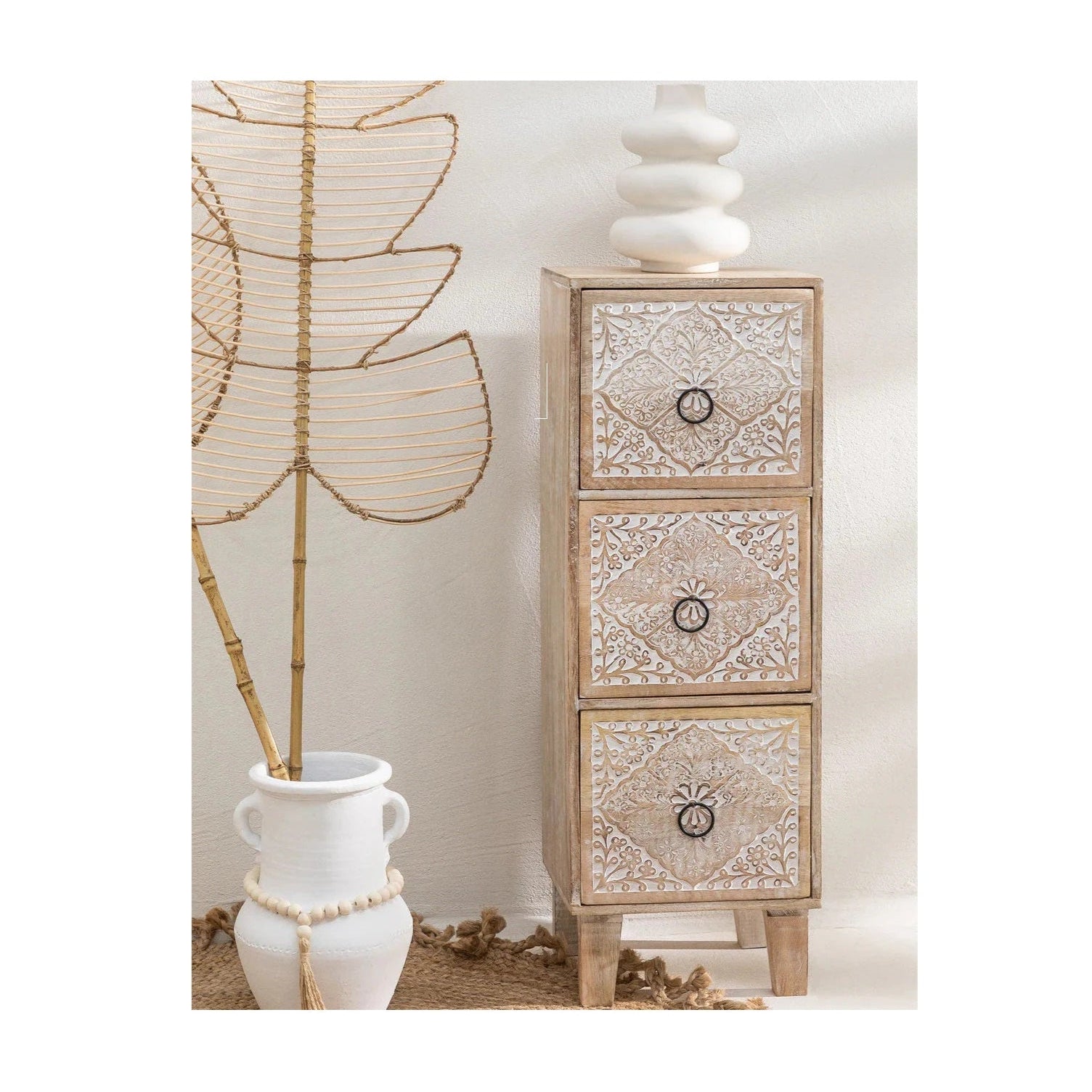 Elevate your space with this stunning Bohemian-inspired, slim three-drawer accent cabinet. Crafted from light-toned wood with deeply carved, distressed white floral and mandala patterns, it offers stylish storage and adds a unique, artisanal touch to any room. Perfect for bedrooms, hallways, or living areas. The cabinet features a naturally light wood finish that highlights the grain and provides a rustic, relaxed aesthetic. Each of the three drawers is adorned with exquisite, hand-carved (or embossed) floral and mandala-style patterns, finished in a distressed white paint that beautifully contrasts with the wood. This white-wash effect enhances the intricate detail and gives the piece an authentic, vintage, or shabby-chic feel.