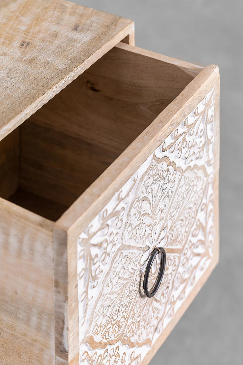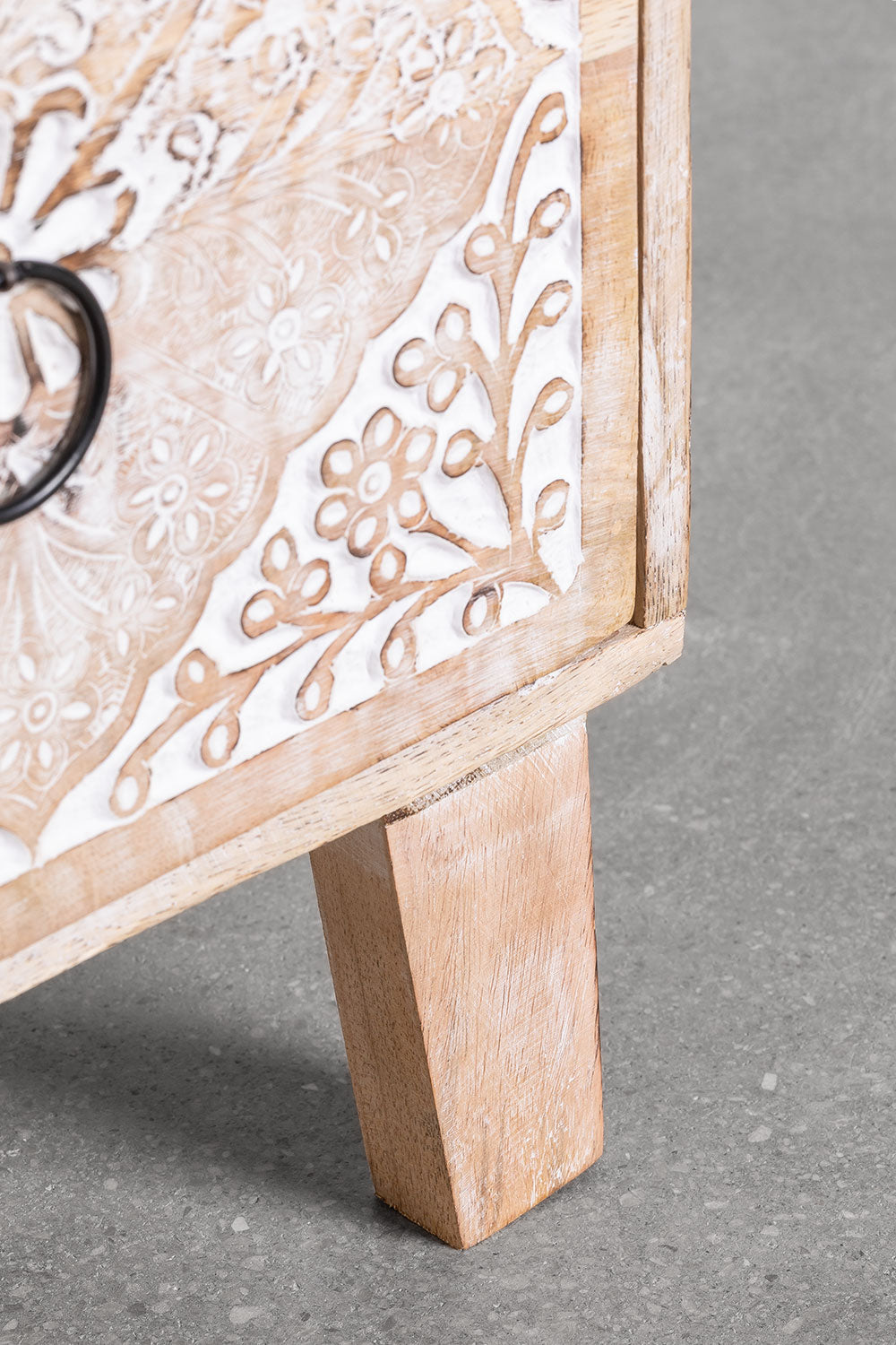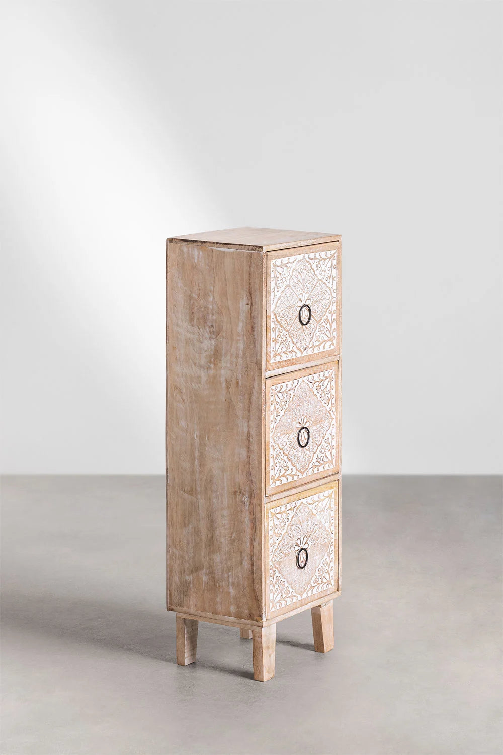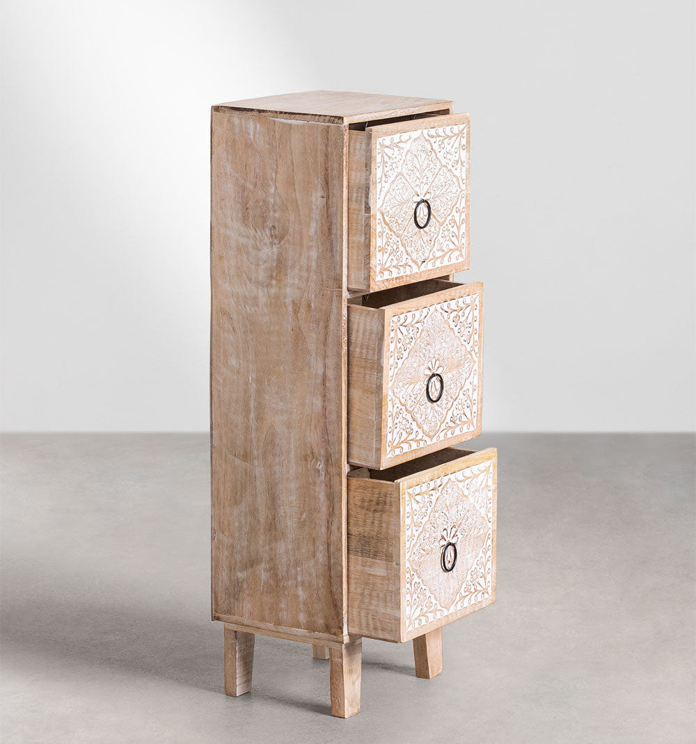 Elevate your space with this stunning Bohemian-inspired, slim three-drawer accent cabinet. Crafted from light-toned wood with deeply carved, distressed white floral and mandala patterns, it offers stylish storage and adds a unique, artisanal touch to any room. Perfect for bedrooms, hallways, or living areas. The cabinet features a naturally light wood finish that highlights the grain and provides a rustic, relaxed aesthetic. Each of the three drawers is adorned with exquisite, hand-carved (or embossed) floral and mandala-style patterns, finished in a distressed white paint that beautifully contrasts with the wood.