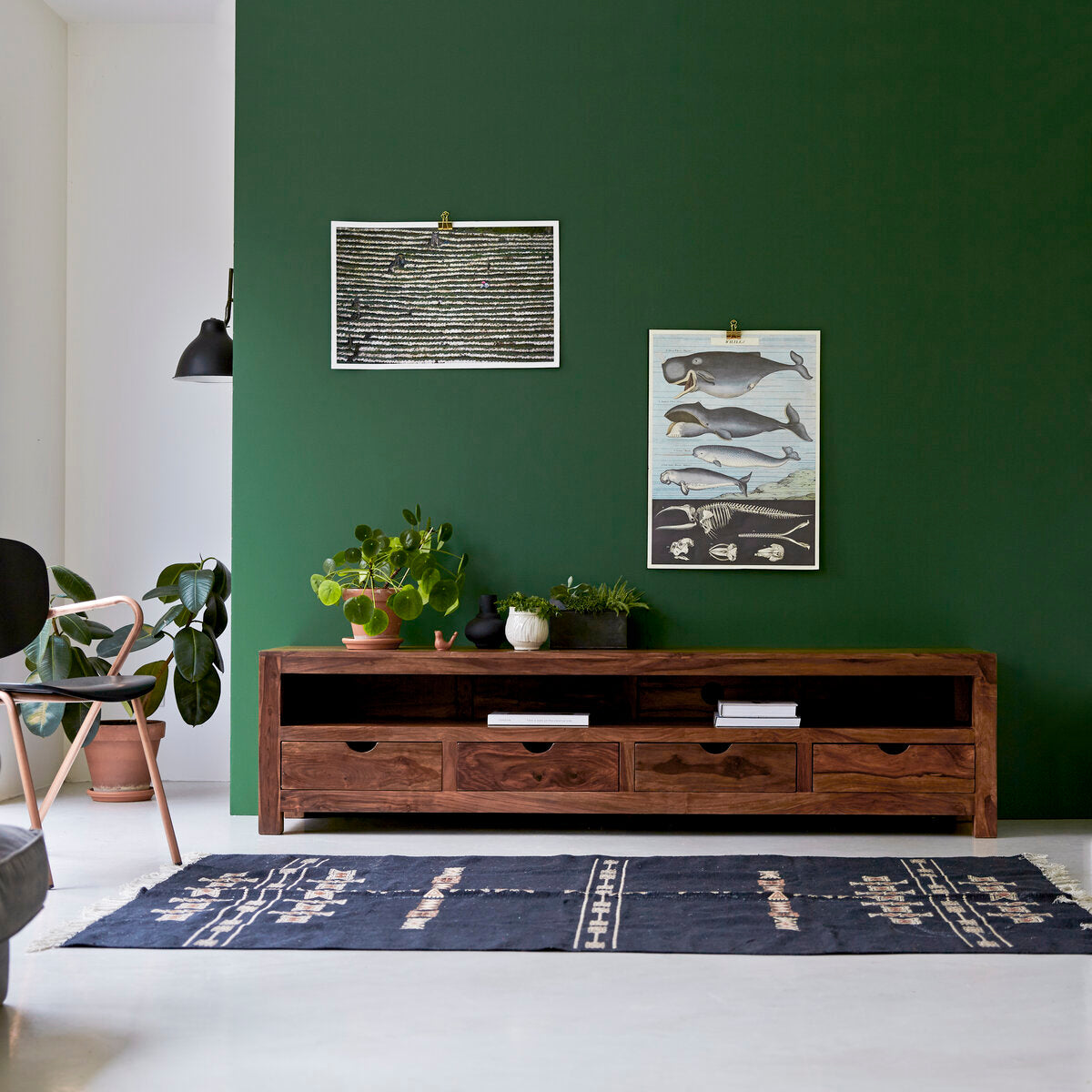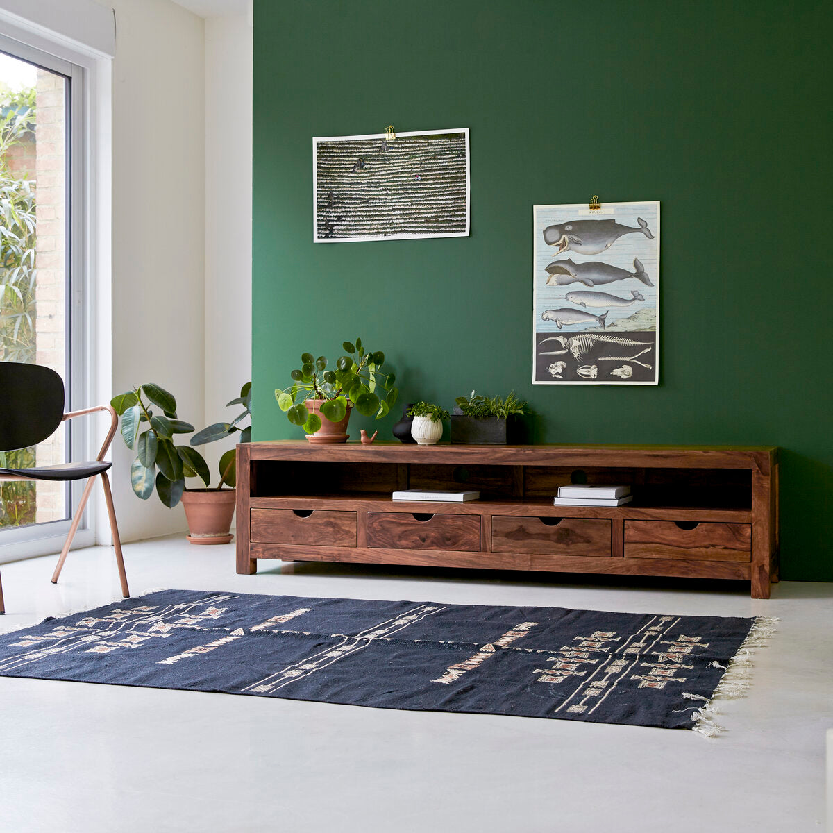 Transform your living space with this striking Mid-Century Modern Solid Wood TV STAND. Handcrafted with rich, deep-toned timber, this low-profile wood TV stand is the perfect blend of timeless style and practical functionality. The spacious surface accommodates large-screen televisions, while the dedicated open shelving is ideal for media players, soundbars, or gaming consoles, ensuring proper ventilation. Two smooth-gliding storage drawers keep your living room essentials, like remotes and accessories, neatly tucked away and clutter-free.