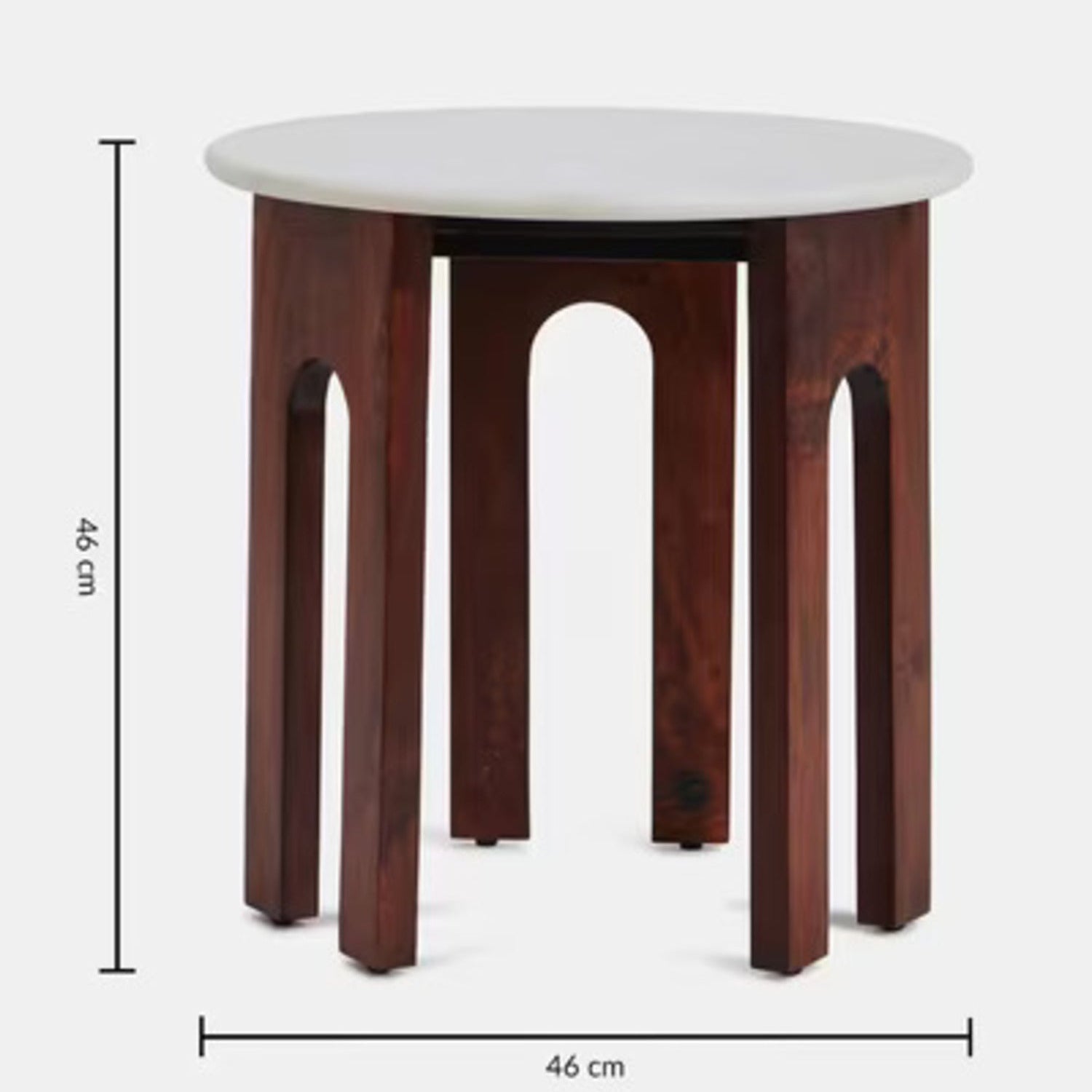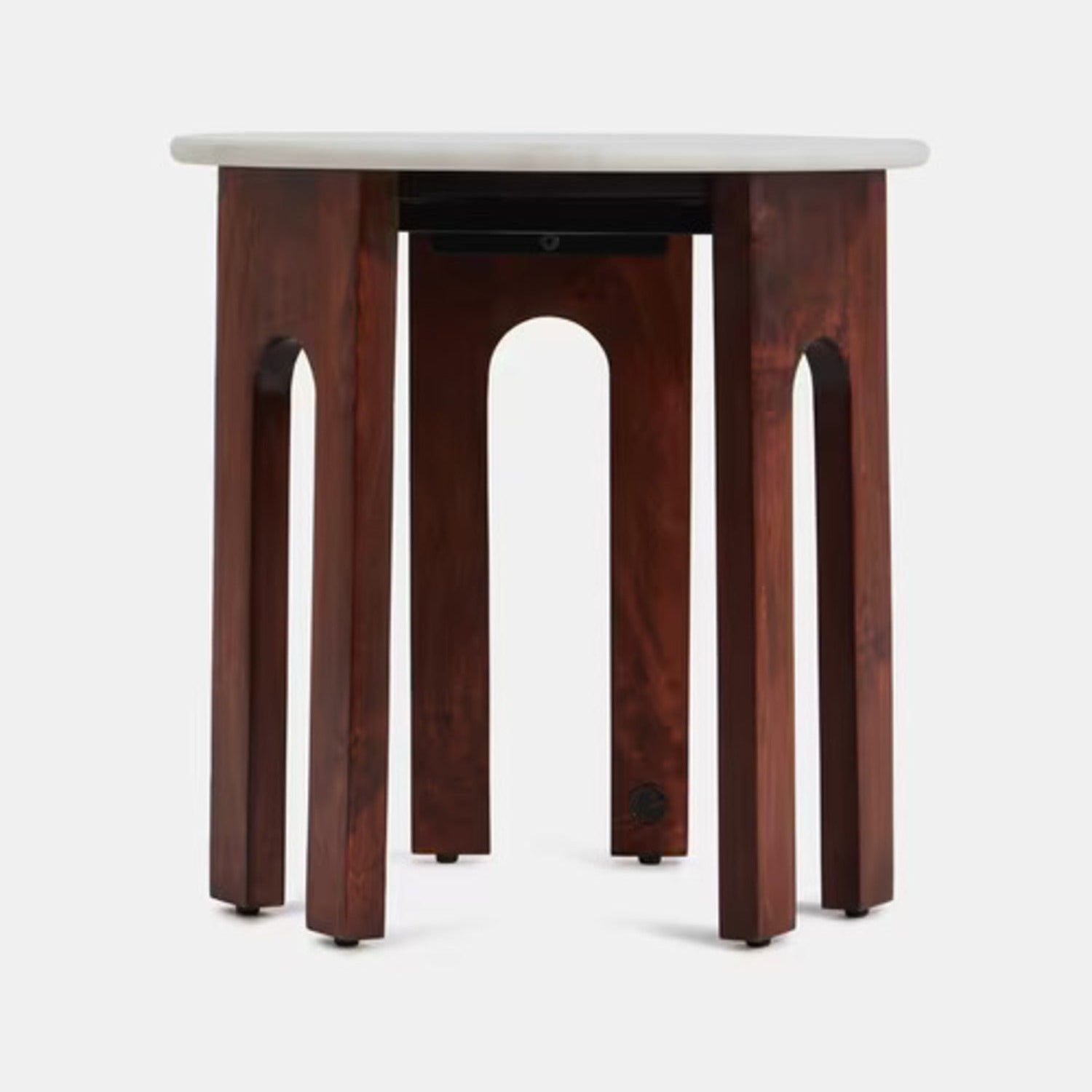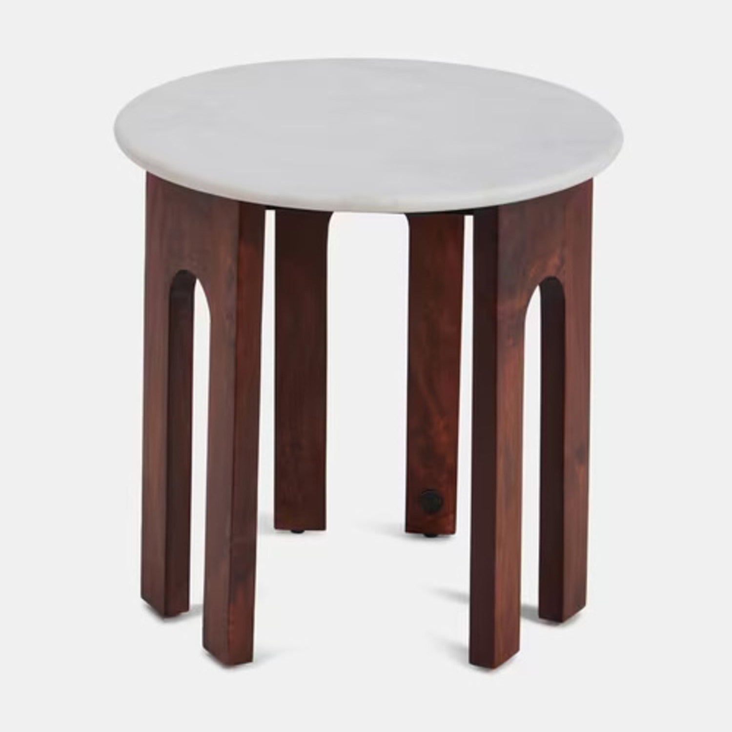 The standout feature is the bold, dark wood base (e.g., Walnut or Dark Oak finish). The sculptural, arch-inspired legs are crafted into a unique pedestal form, providing superior stability and a compelling focal point. This contrast of light marble and rich, dark wood makes the accent table an incredibly versatile addition to Mid-Century Modern, Contemporary, or Transitional interiors.