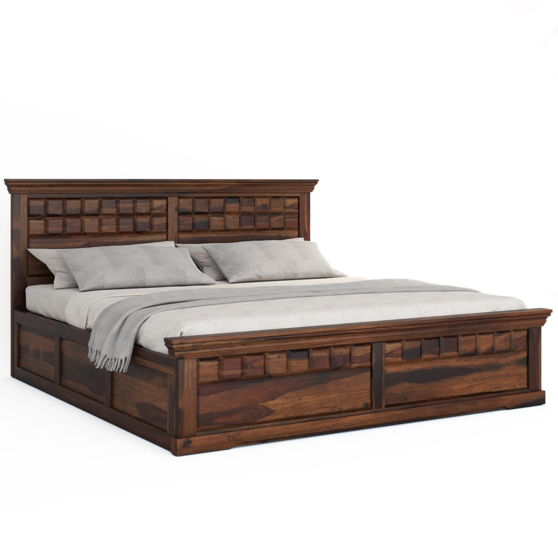 Add elegance and functionality to your bedroom with this Sheesham Wood King Size Bed with Hydraulic Storage, designed for modern Indian homes. Handcrafted from 100% solid Sheesham wood, this bed reflects rich craftsmanship and long-lasting durability. Its premium walnut finish enhances the natural wood grain, offering a sophisticated and luxurious look.