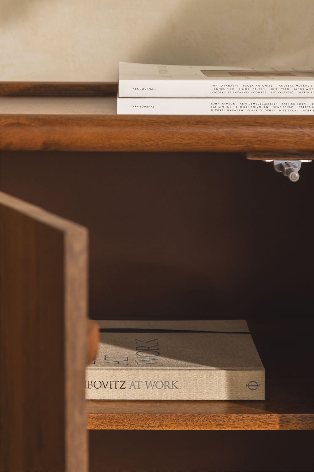 This sideboard is available in versatile styles, including a full natural wood door finish or an eye-catching design featuring tan leather or faux-leather door panels secured by unique metal corner accents. Ideal as a centerpiece media console in the living room or a stylish storage buffet in the dining area.