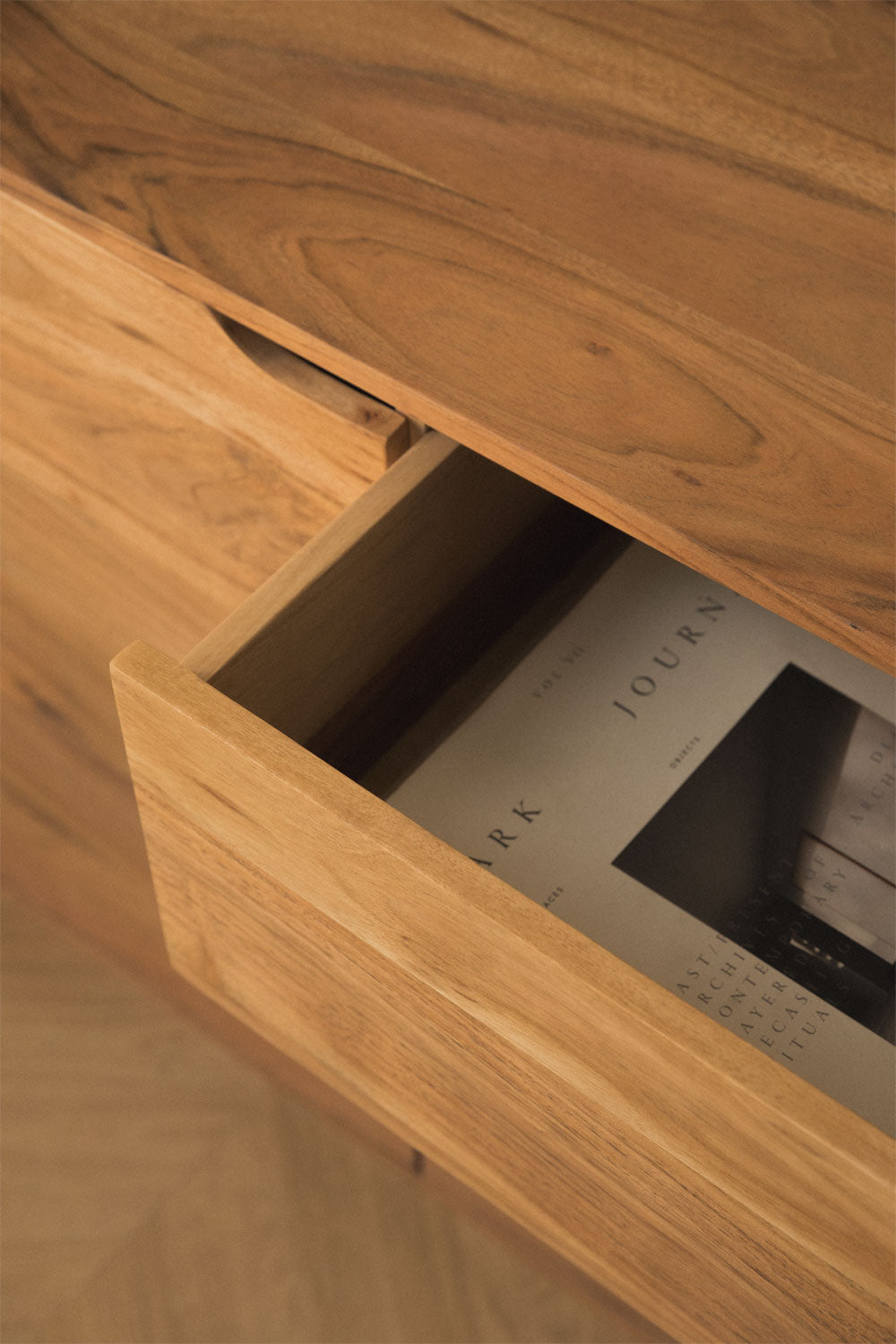 Stunning Solid Acacia Wood Sideboard featuring a rich, distinctive grain and modern rustic appeal. Offers versatile storage with two cabinets and three central drawers, complete with recessed handles and a solid plinth base for a contemporary, grounded look.