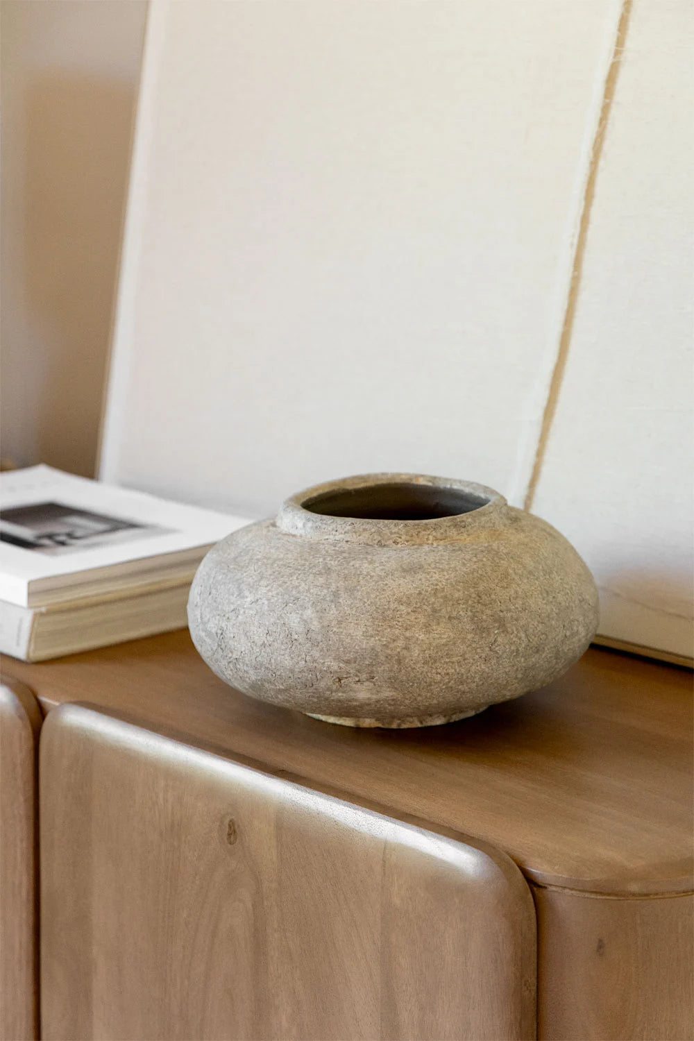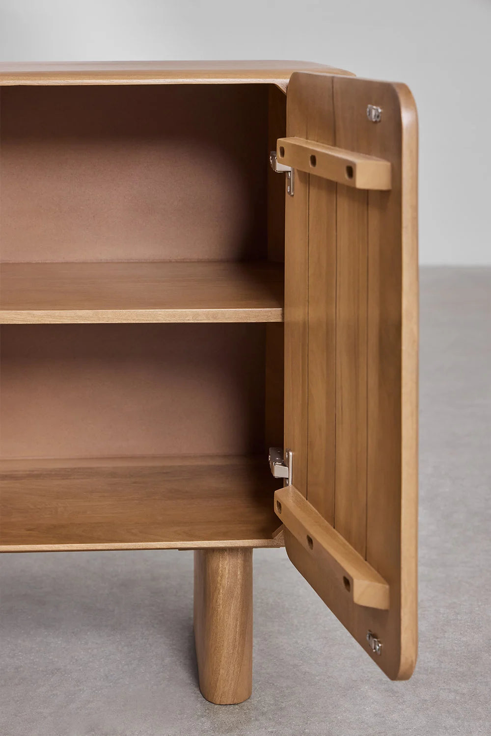 Crafted from beautiful natural solid wood, the grain patterns add warmth and character, making each unit unique. The sideboard stands on two integrated, chunky block legs that are slightly recessed to give the piece a sturdy yet floating appearance.