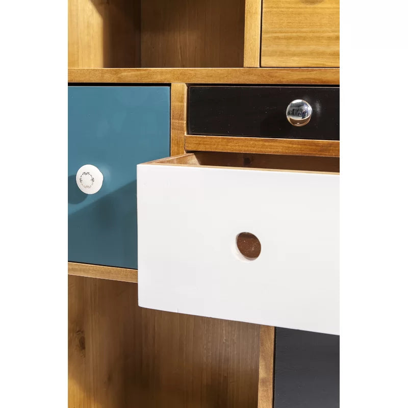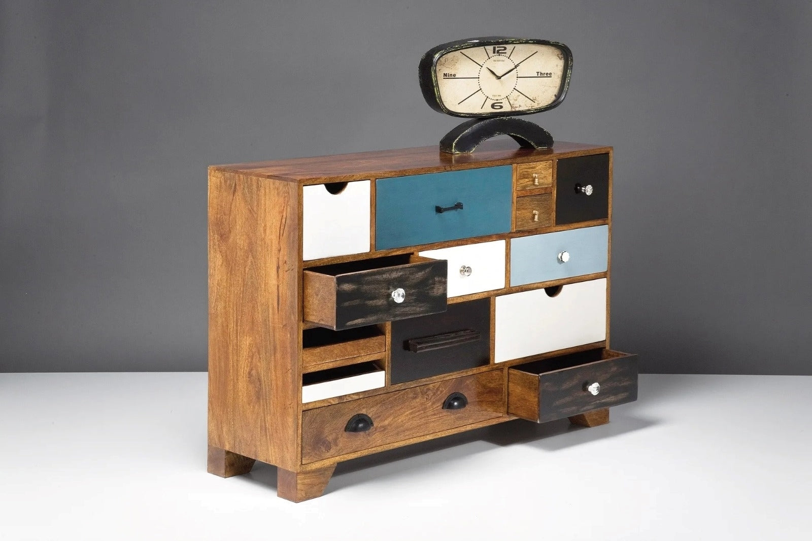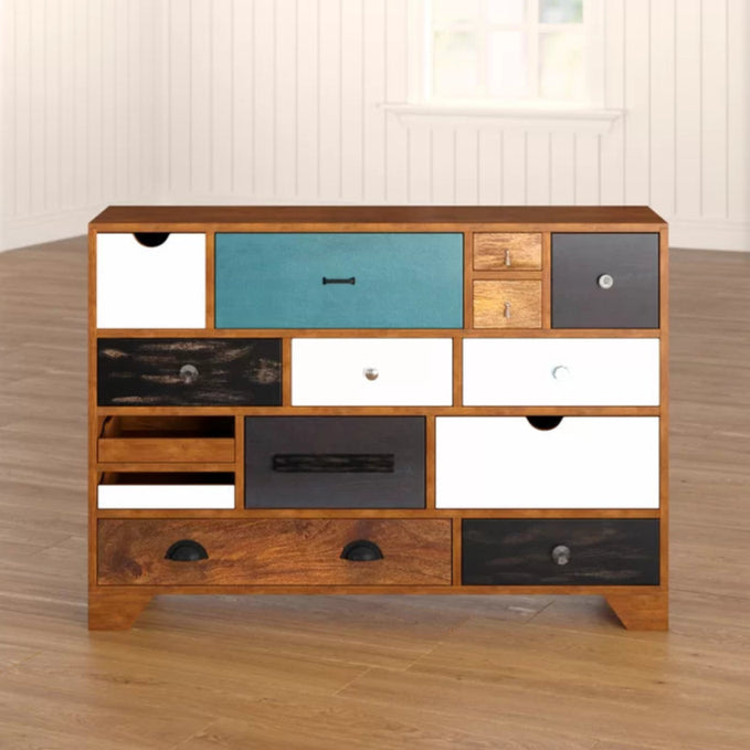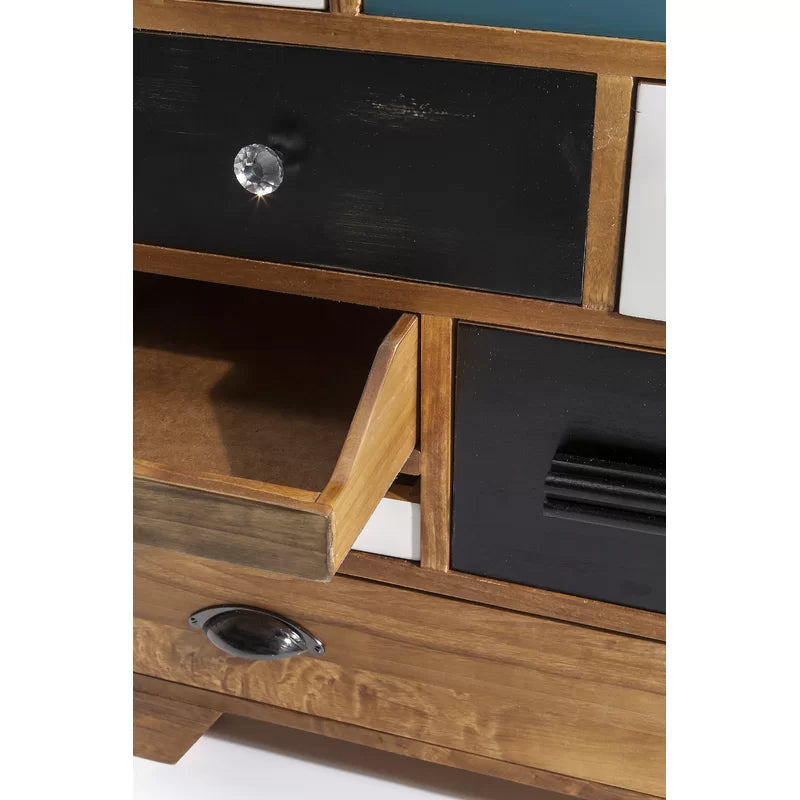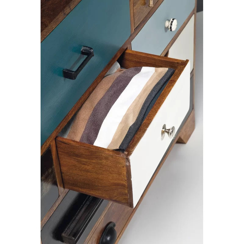 - Eclectic Multi-Color Design: The drawer fronts are finished in an intentional "patchwork" of colors, including natural wood, distressed black, white, and a vibrant teal/turquoise.