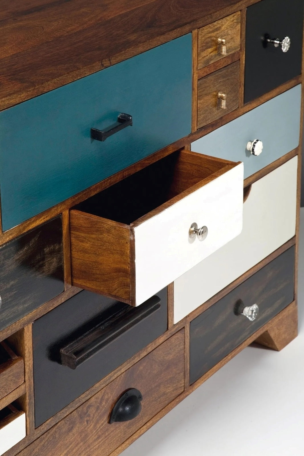 This stunning, handcrafted chest is a true celebration of bohemian and industrial design. It's constructed from durable, rustic-toned Mango Wood, providing a warm, natural foundation that anchors its vibrant facade. The most captivating feature is its "patchwork" layout of thirteen drawers in various sizes, colors, and textures.